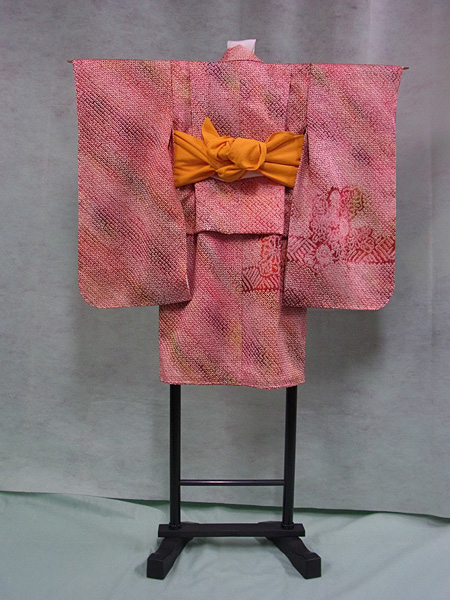 子供用着物 おばあちゃんの羽織からお孫さんの女児着物に仕立て直し 大人用の仕立て上がりの羽織を子供用に仕立て直すには、どうしても前後を替えることになります。 羽織の前の衿付けのところは、前落としと言って、マチと袖口分になっていますので、前を後身頃にします。そして、あとで前身頃と衽部分をつまんで取ります。裾返りは、裾でつまんでふきを作ります。 柄は、腰揚げで見えなくなってしまいましたが、可愛い帯やしこきで可愛らしくお召し頂ければと思う、逸品です。 |←前の事例|次の事例→|