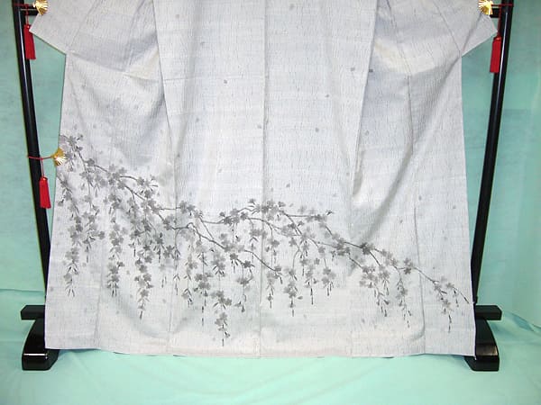 泥染めの大島紬きものに木目絞りの絞り技法を加え、後書きで枝垂れ桜を右袖表裏、着物の裾の部分、前後一面にそして、着物全体に桜の花びらがチラチラと散っている様を墨描きで描かれています。先染め(泥染め)の大島紬着物だけでも十分に高価なお召し物になるのに、大変贅沢に手書きで枝垂れ桜を描き、絞りの技法を使い生地に凹凸をつけて、桜の模様を大島紬全体を立体感や遠近感を出しいます。泥染めの職人さん、木目絞りの職人さん、そして、染色作家の墨描きと着物布に模様を表現するだけで少なくとも3人の職人さんが携わっている大変手の込んだ大島紬です。そんな大島紬着物ですが、仕立てに関しては生地に絞りの凹凸があって、少しだけ縫い難かっただけで、後はあまり難しいとか大変と言うところは無く綺麗に仕立て上げました。