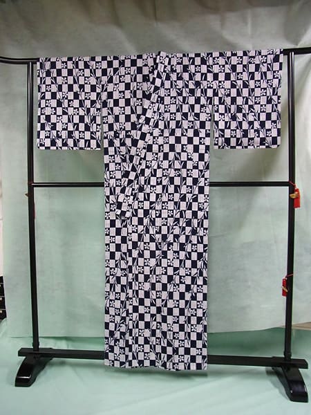 女性用の浴衣の仕立てをしました。木綿地に桜と柳の植物文様に白と黒の正方形を縦と横に並べた市松の幾何学文様、小紋柄の浴衣です。