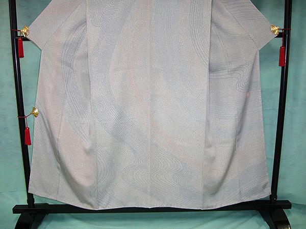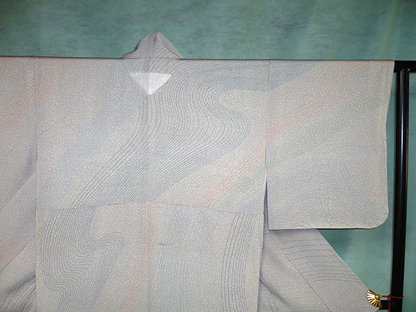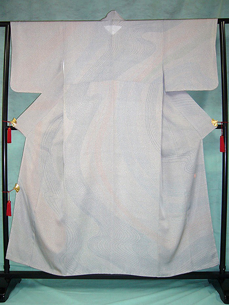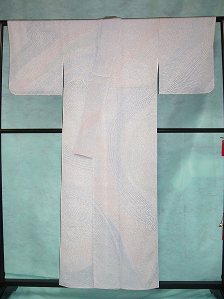 水面を彩る水の波紋と光。その光を受けて色を変える水面。 揺蕩う(タユタウ)水のさまを広々としてとらえどころのない水を線だけで表した優れた訪問着です。優しい筆使いな柄ゆき、そして淡い地色、所々に色を挿しているものの、『水色』主体の色使いが研ぎ澄まされたような神聖な美しさを醸し出しています。簡素な中にも、そこはかとない粋さが感じられ『水色』という色の美しさに改めて思い至らされます。変幻自在に描かれる水模様は趣味性に富んでおり、個性的な装いを楽しみたい方にお薦めです。